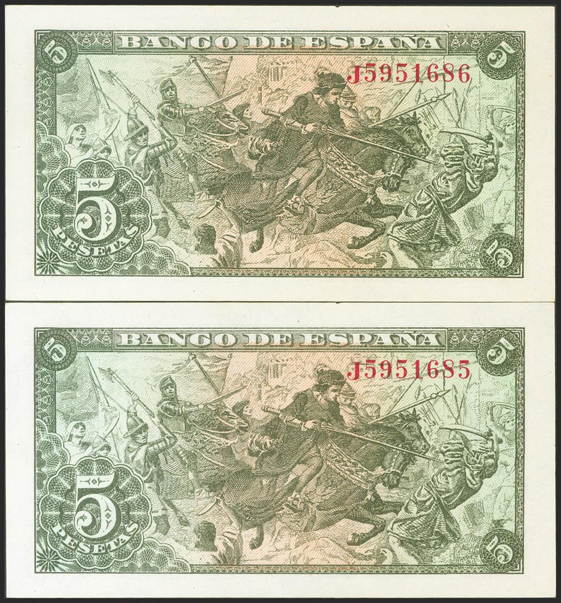 5 Pesetas. 15 de Julio de 1945. Pareja correlativa. Serie J. (Edifil 2021: 449a). Apresto original. SC.