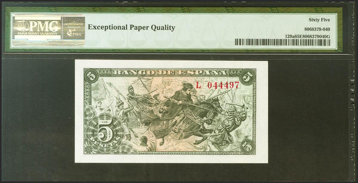 5 Pesetas. 15 de Junio de 1945. Serie L, última serie emitida. (Edifil 2021: 449a, Pick: 129a). Raro, especialmente en esta excepcional calidad, apresto original. SC. Encapsulado PMG65EPQ.