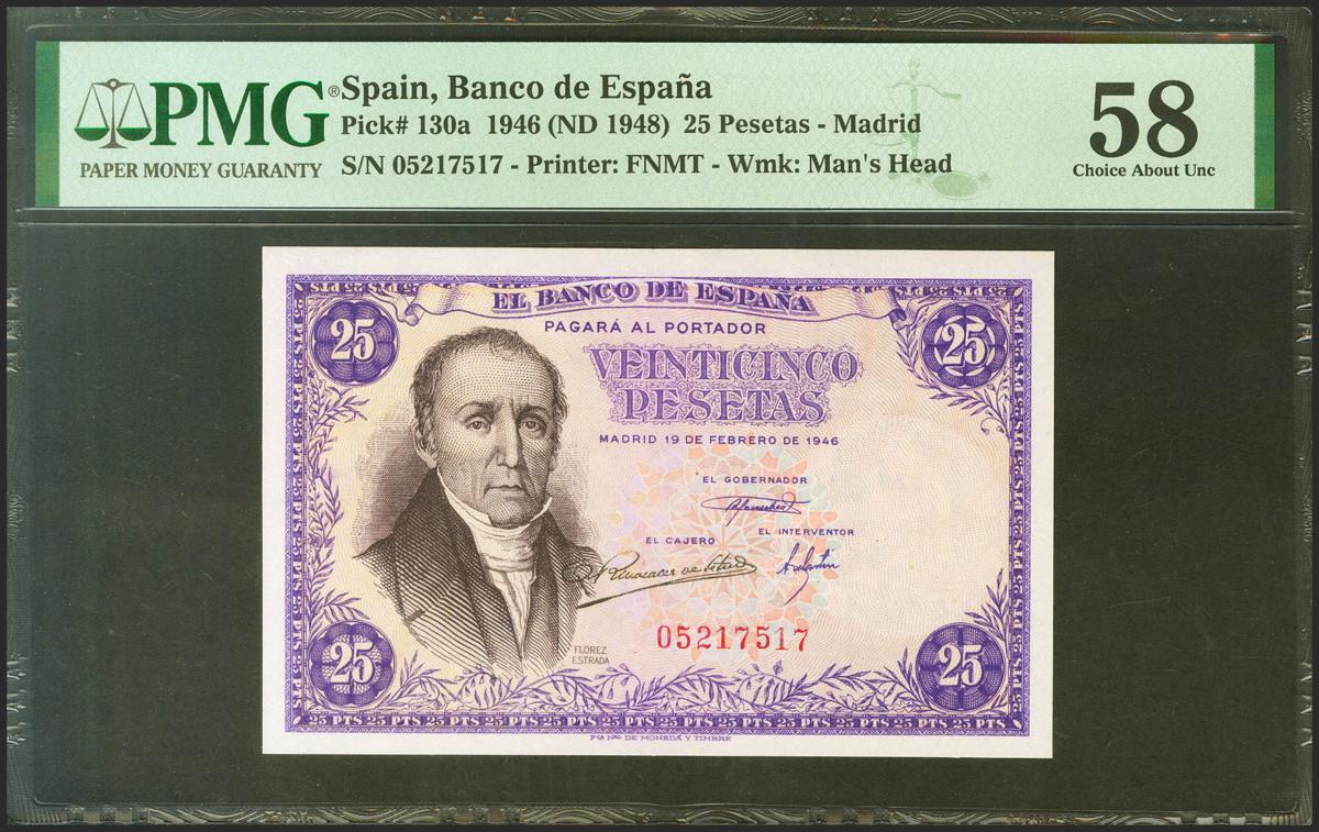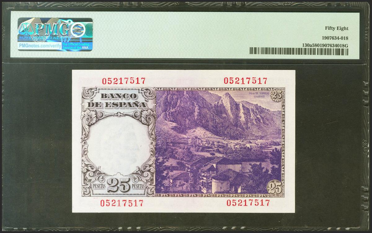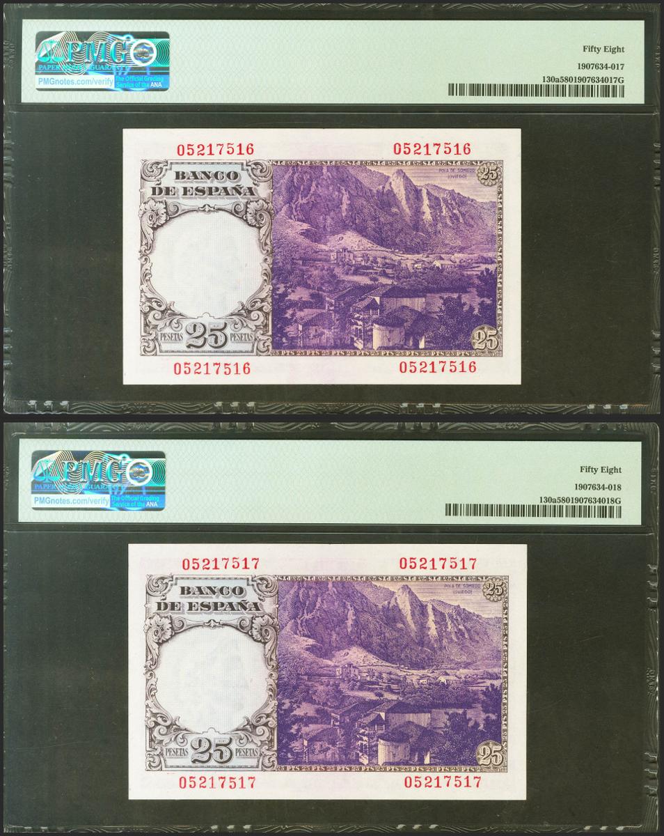 25 Pesetas. 19 de Febrero de 1946. Pareja correlativa. Sin serie. (Edifil 2021: 450, Pick: 130a). EBC++. Encapsulado PMG58, ambos.