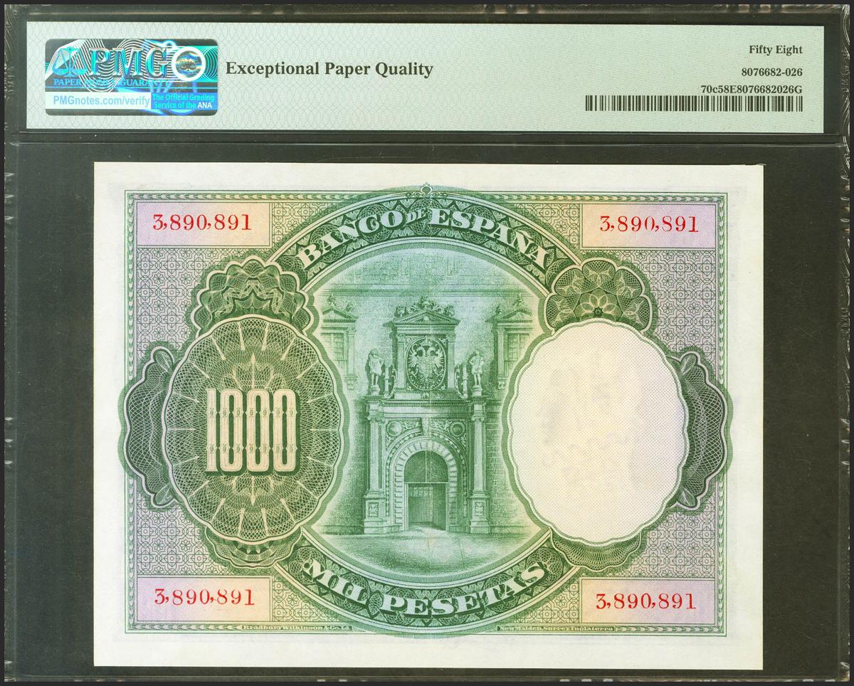 1000 Pesetas. 1 de Julio de 1925. Sin serie y numeración superior al 3646000. (Edifil 2021: 351, Pick: 70c). Inusual en esta calidad, apresto original. EBC+++. Encapsulado PMG58EPQ.
