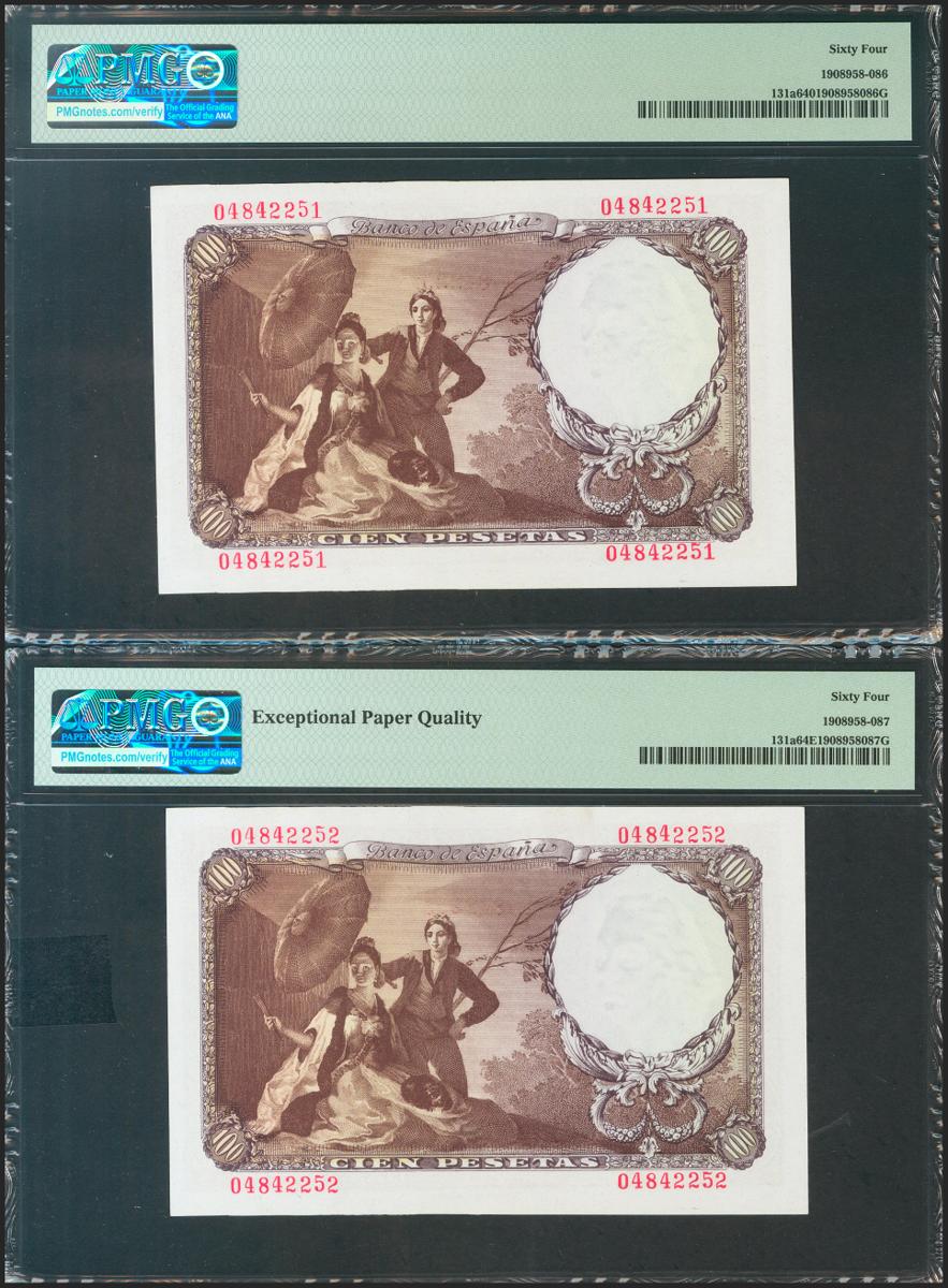 100 Pesetas. 19 de Febrero de 1946. Pareja correlativa. Sin serie. (Edifil 2021: 451, Pick: 131a). Inusual en esta calidad. SC. Encapsulado PMG64EPQ/64.