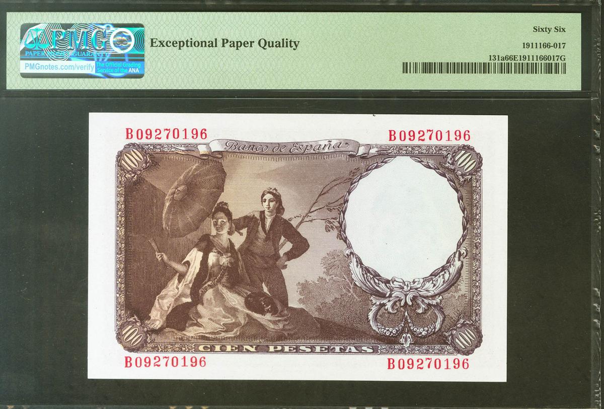 100 Pesetas. 19 de Febrero de 1946. Serie B. (Edifil 2021: 451b, Pick: 131a). Rara en esta excepcional calidad, apresto original. SC. Encapsulado PMG66EPQ.