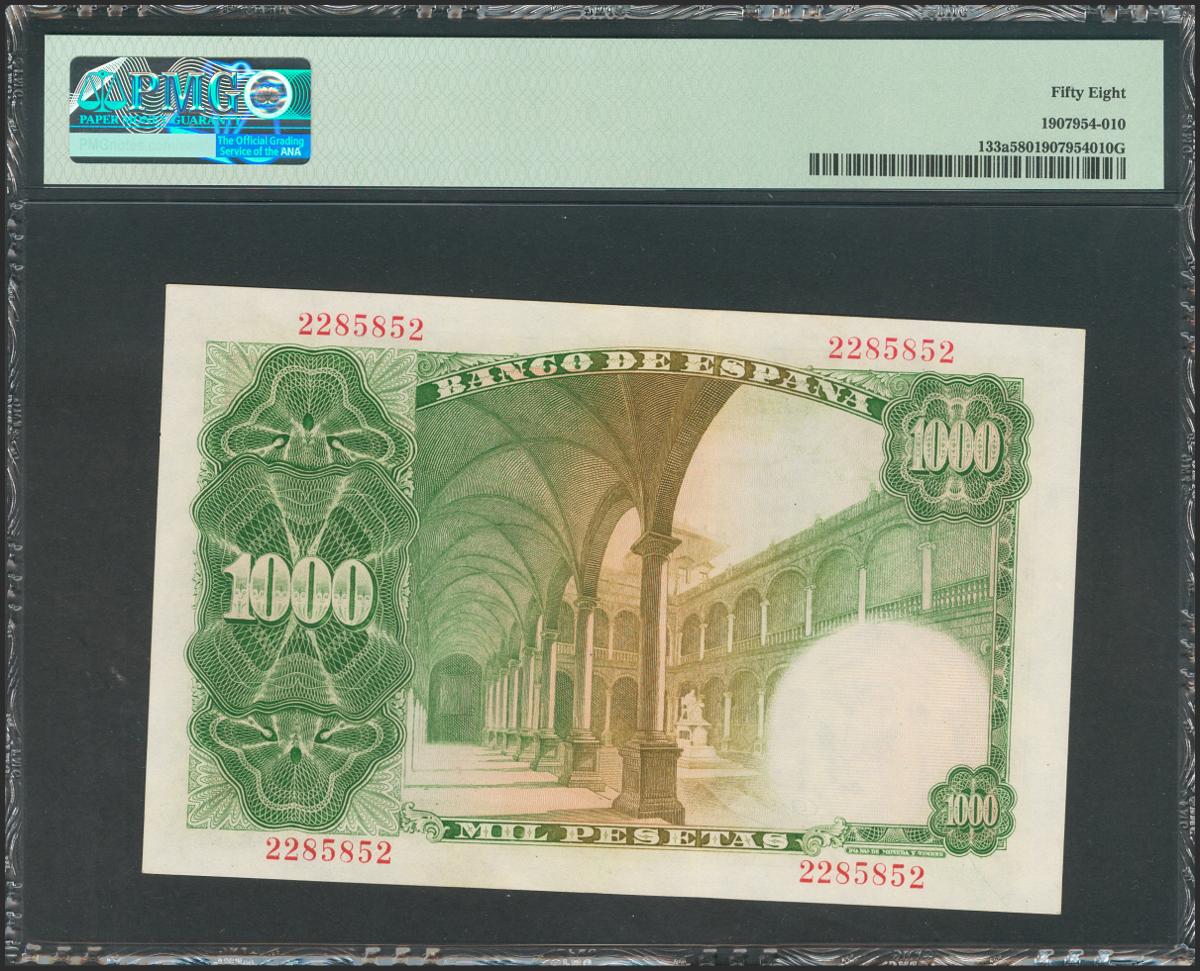 1000 Pesetas. 19 de Febrero de 1946. Sin serie. (Edifil 2017: 453). Rarísimo en esta calidad. EBC+. Encapsulado PMG58.