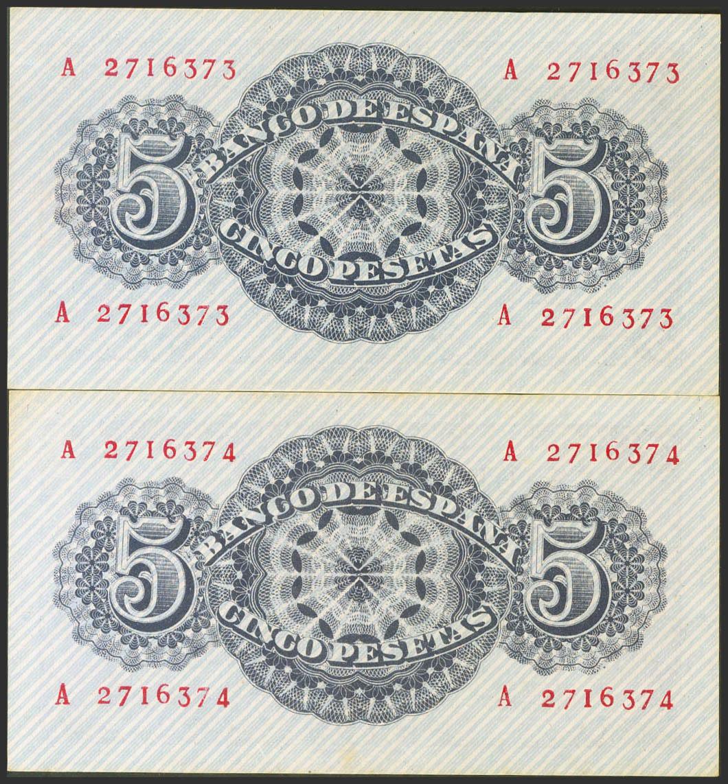 5 Pesetas. 12 de Abril de 1947. Pareja correlativa. Serie A. (Edifil 2021: 454a). Apresto original. EBC+.