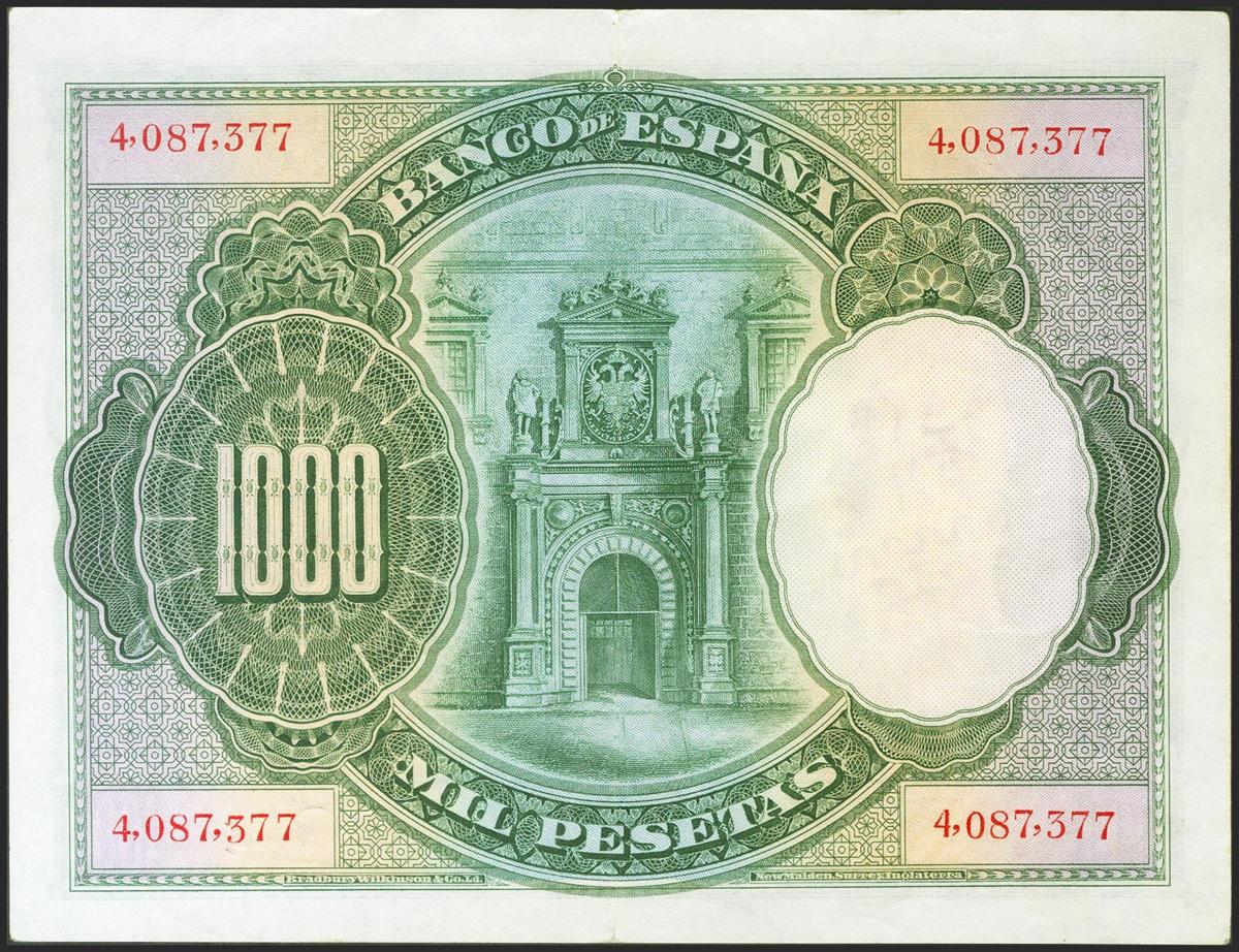 1000 Pesetas. 1 de Julio de 1925. Sin serie y numeración posterior a 3646000. (Edifil 2021: 351, Pick: 70c). Conserva parte del apresto original. EBC.