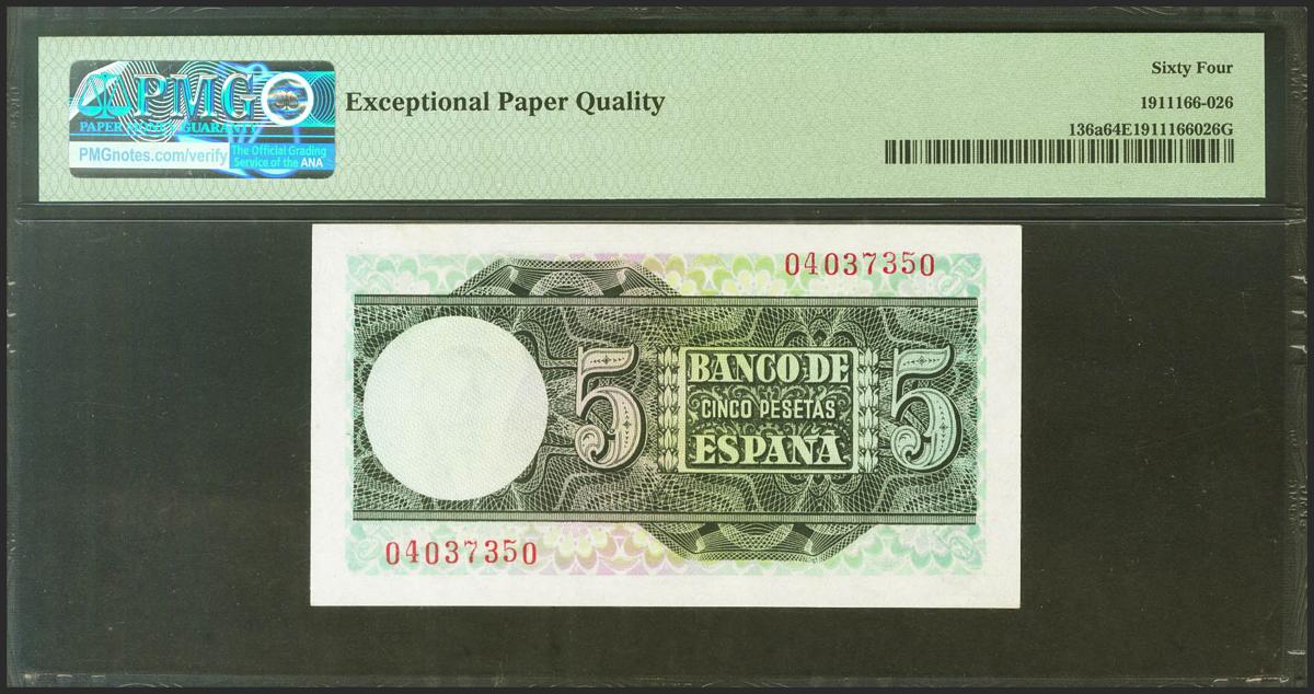 5 Pesetas. 15 de Marzo de 1948. Sin serie. (Edifil 2021: 455, Pick: 136a). Apresto original. SC. Encapsulado PMG64EPQ.