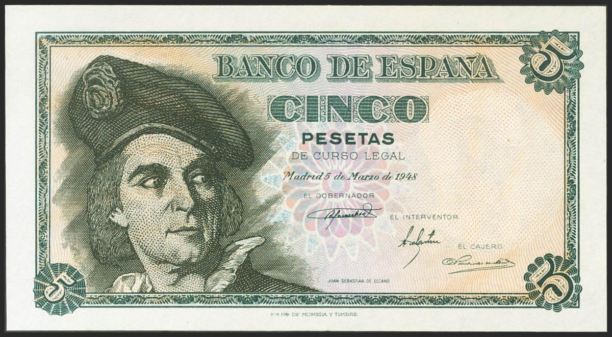 5 Pesetas. 5 de Marzo de 1948. Serie A. (Edifil 2021: 455a). Apresto original. EBC+.