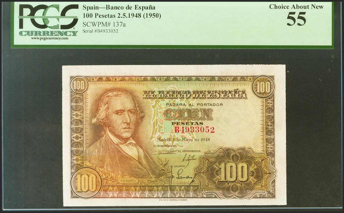 100 Pesetas. 2 de Mayo de 1948. Serie B. (Edifil 2021: 456a, Pick: 137a). EBC+. Encapsulado PCGS55.