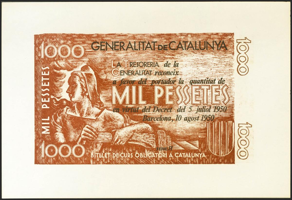 Prueba en color castaño de un billete No Emitido de la Generalitat de Catalunya de 1000 Pesetas, fechada el 10 de Agosto de 1950, con la serie H. (billete emitido privadamente, sin respaldo legal). SC-.