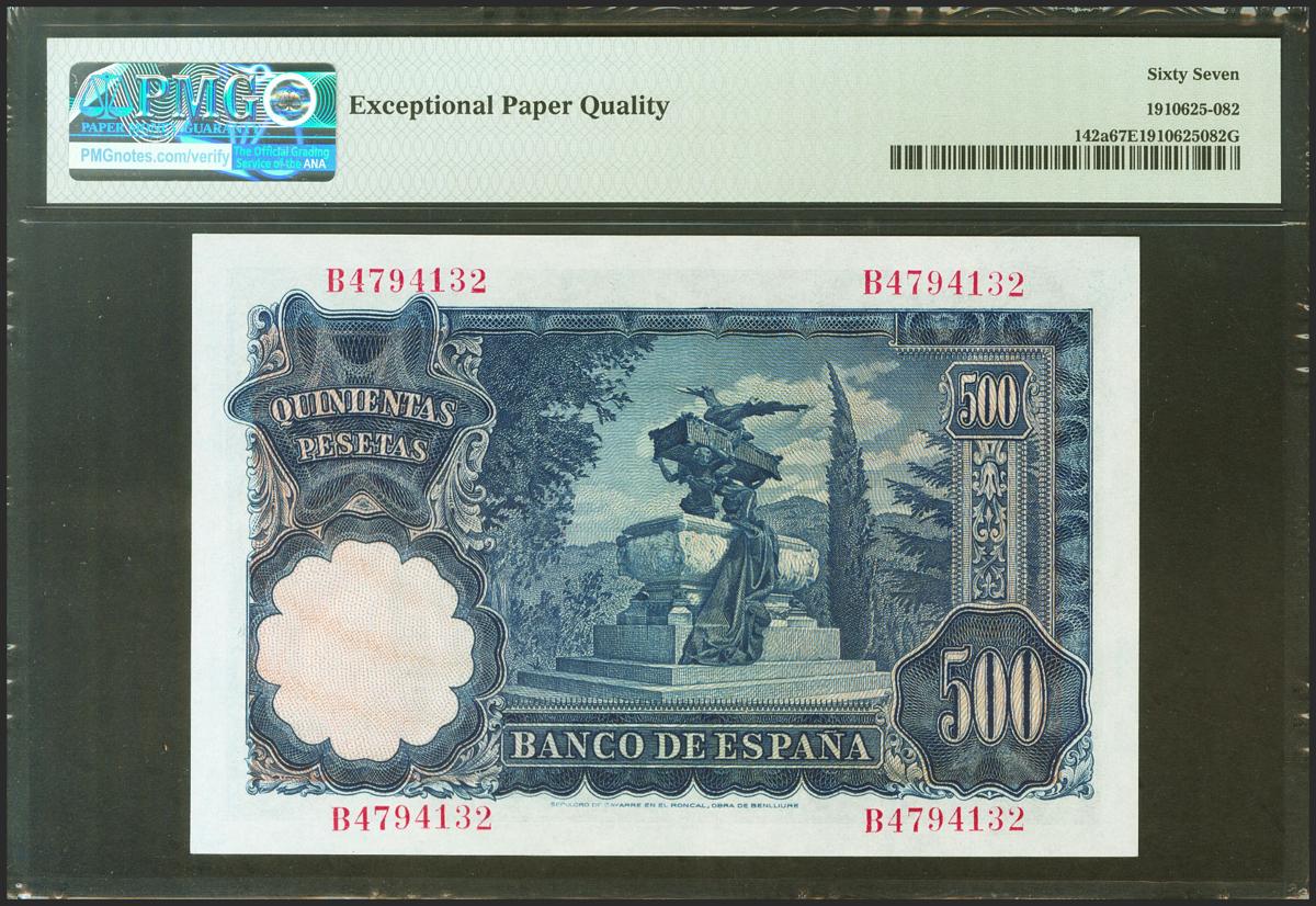 500 Pesetas. 15 de Noviembre de 1951. Serie B. (Edifil 2021: 460a). Extraordinariamente raro en esta excepcional calidad, conserva todo su apresto original. SC. Encapsulado PMG67EPQ.