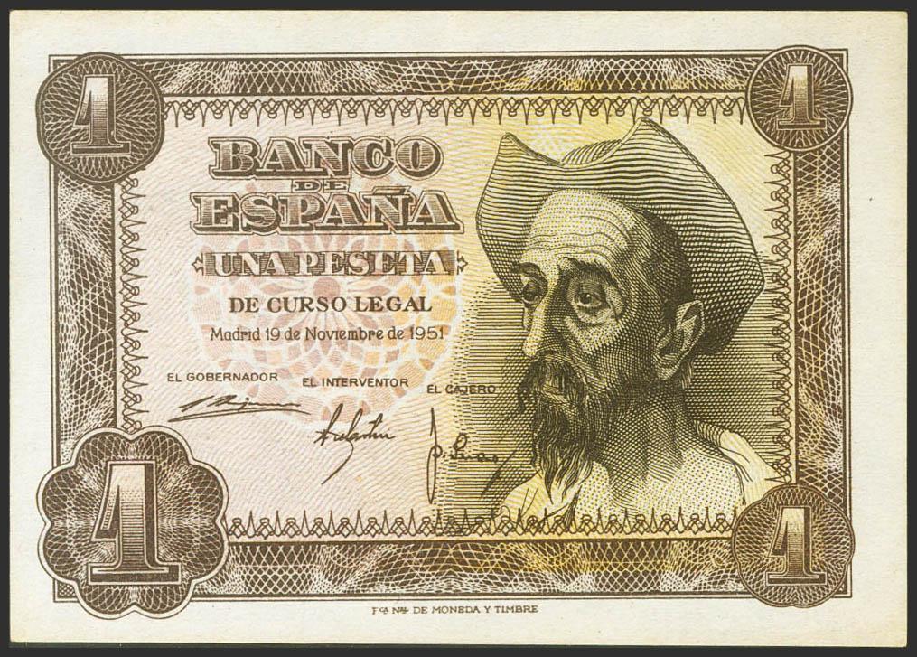 1 Peseta. 19 de Noviembre de 1951. Sin serie. (Edifil 2021: 461). Conserva parte de su apresto original. EBC.