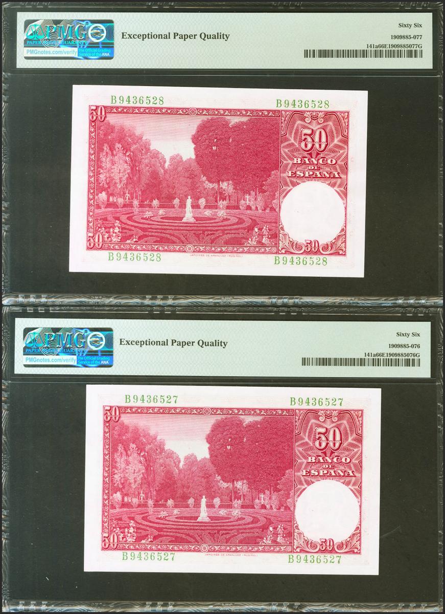 50 Pesetas. 31 de Diciembre de 1951. Pareja correlativa. Serie B. (Edifil 2021: 462a, Pick: 141a). Rara en esta excepcional calidad, apresto original. SC. Encapsulado PMG66EPQ, ambos.