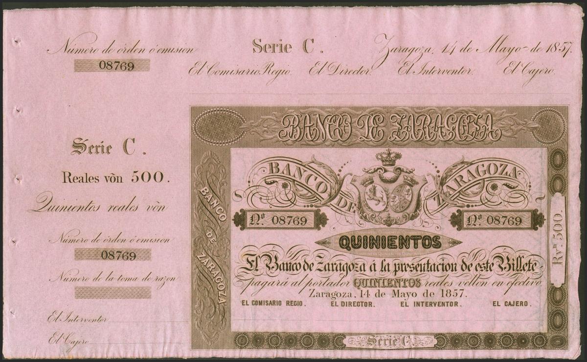 500 Reales. 14 de Mayo de 1857. Banco de Zaragoza. Serie C y con matriz. (Edifil 2021: 128B). Apresto original. SC.