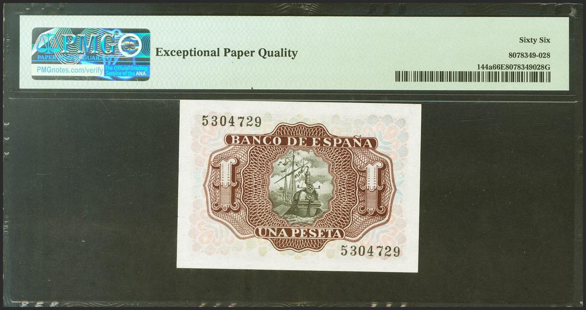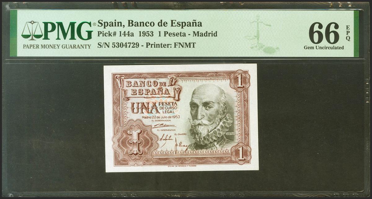 1 Peseta. 22 de Julio de 1953. Sin serie. (Edifil 2021: 465, Pick: 144a). Inusual en esta excepcional calidad, apresto original. SC. Encapsulado PMG66EPQ.