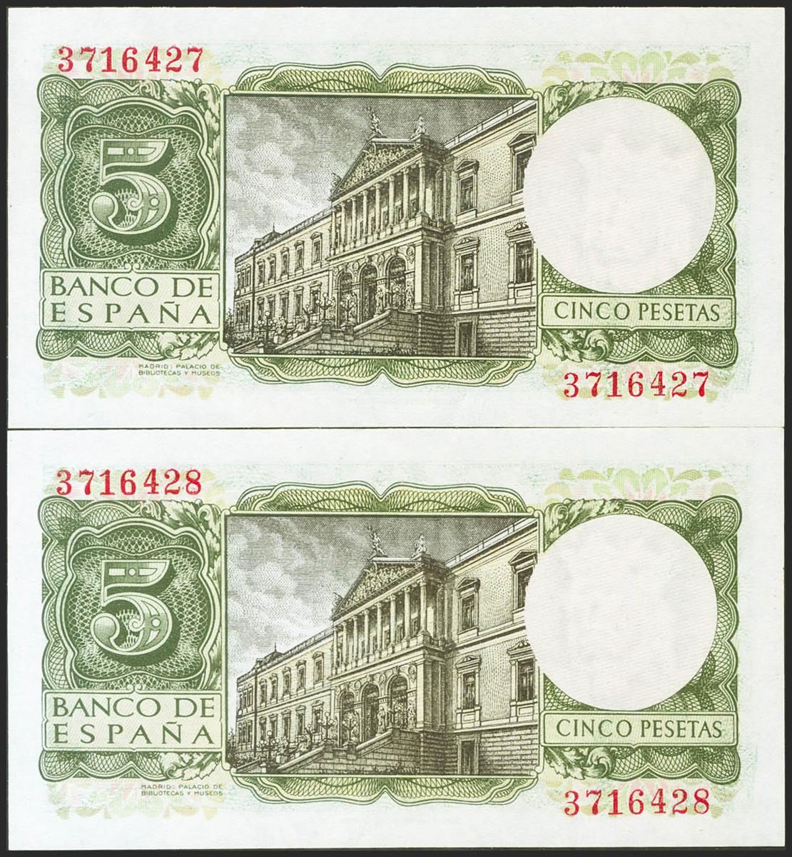 5 Pesetas. 22 de Julio de 1954. Pareja correlativa. Sin serie. (Edifil 2021: 466). Conserva todo el apresto original. SC.