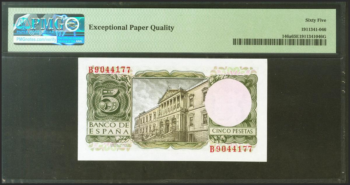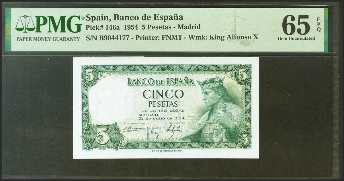 5 Pesetas. 22 de Julio de 1954. Serie B. (Edifil 2021: 466a, Pick: 146a). Apresto original. SC. Encapsulado PMG65EPQ.