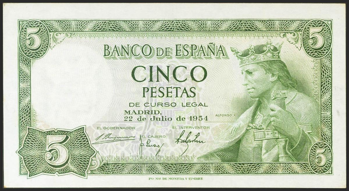 5 Pesetas. 22 de Julio de 1954. Serie M. (Edifil 2021: 466a). Conserva todo su apresto original, sombritas del tiempo. EBC+.