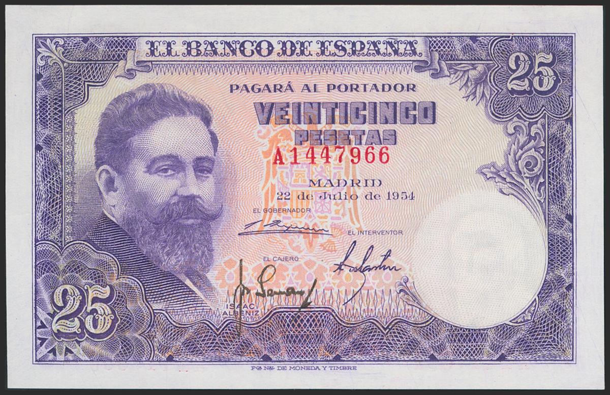 25 Pesetas. 22 de Julio de 1954. Serie A. (Edifil 2021: 467a). Apresto original. SC-.