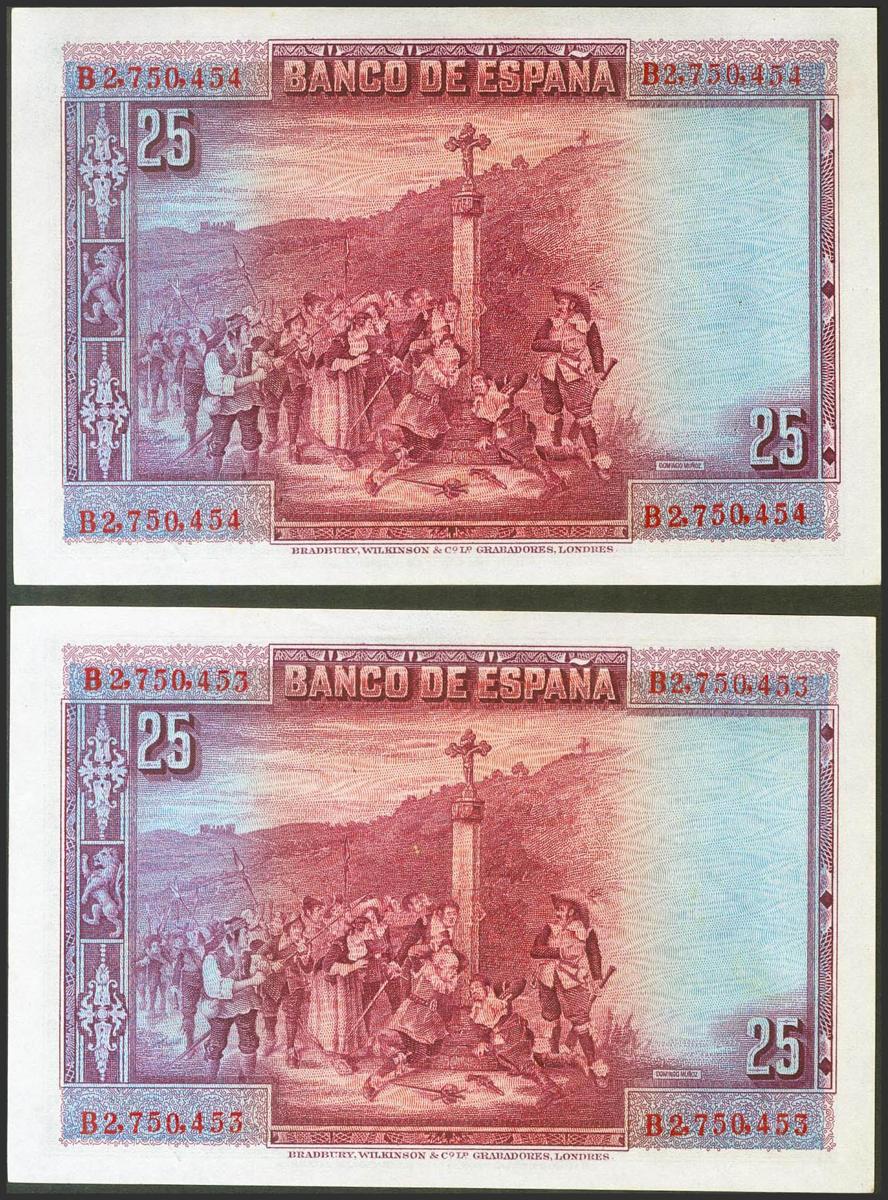 25 Pesetas. 15 de Agosto de 1928. Pareja correlativa. Serie B. (Edifil 2021: 353). Apresto original. SC-.