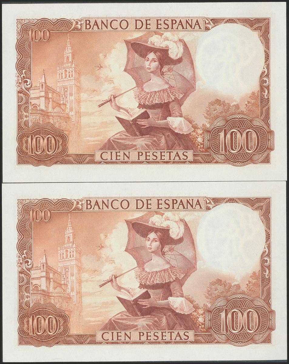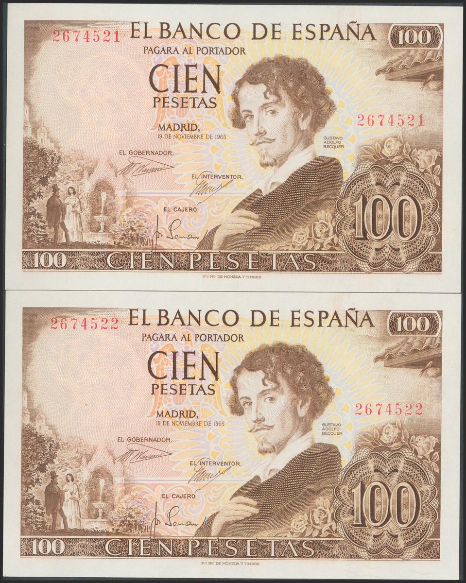 100 Pesetas. 19 de Noviembre de 1965. Pareja correlativa. Sin serie. (Edifil 2017: 470). Apresto original. SC.
