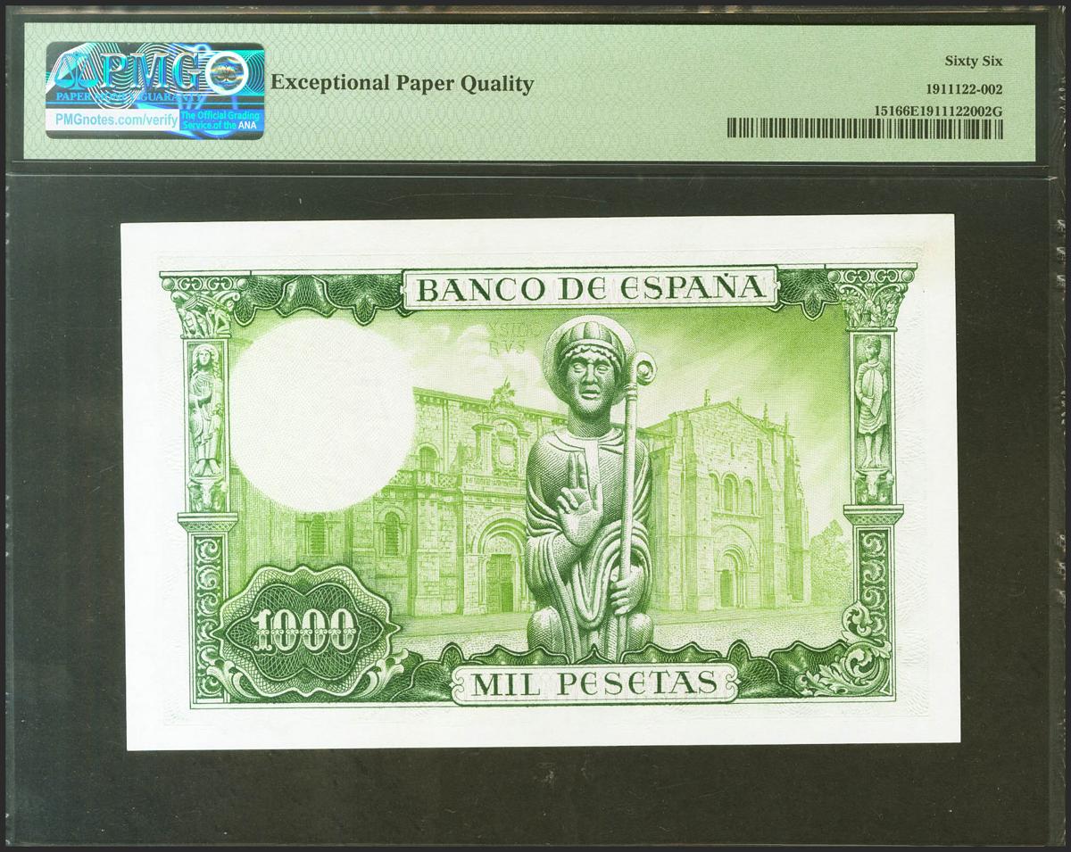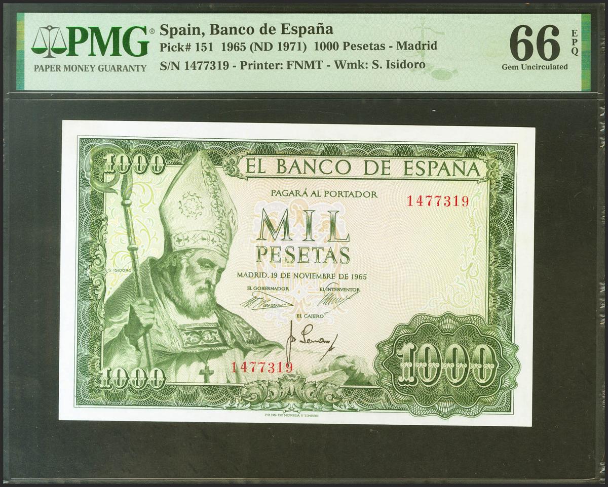 1000 Pesetas. 19 de Noviembre de 1965. Sin serie. (Edifil 2021: 471, Pick: 151). Raro en esta excepcional calidad, apresto original. SC. Encapsulado PMG66EPQ.