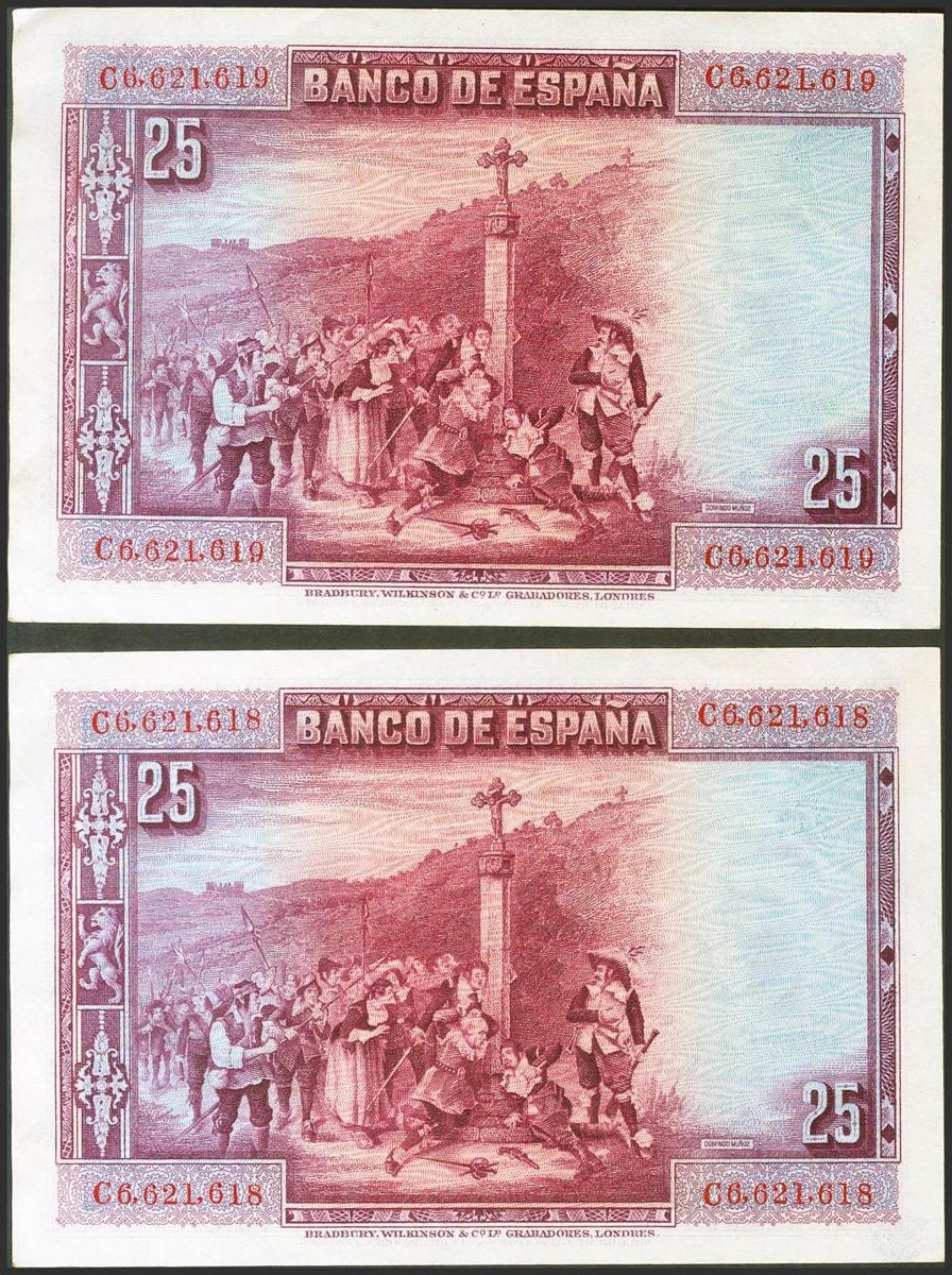 25 Pesetas. 15 de Agosto de 1928. Pareja correlativa. Serie C. (Edifil 2021: 353). Apresto original. SC-.