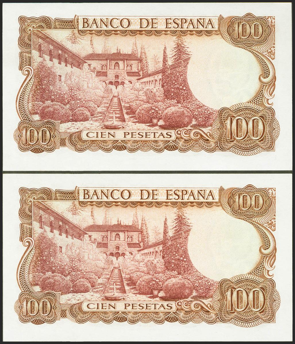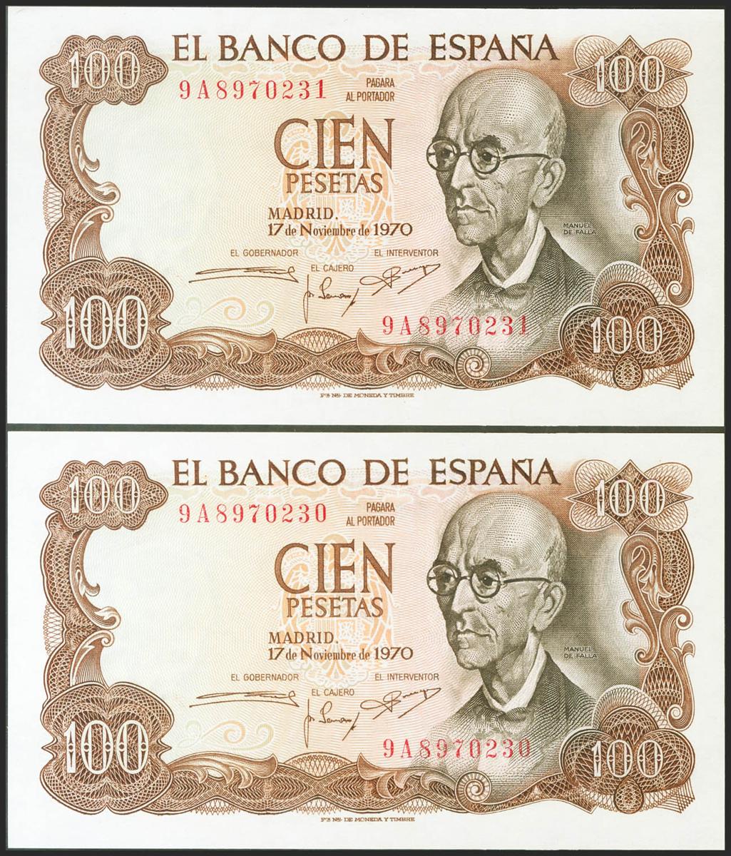 100 Pesetas. 17 de Noviembre de 1970. Pareja correlativa. Serie especial 9A. (Edifil 2021: 472d). Conserva todo su apresto original. SC.