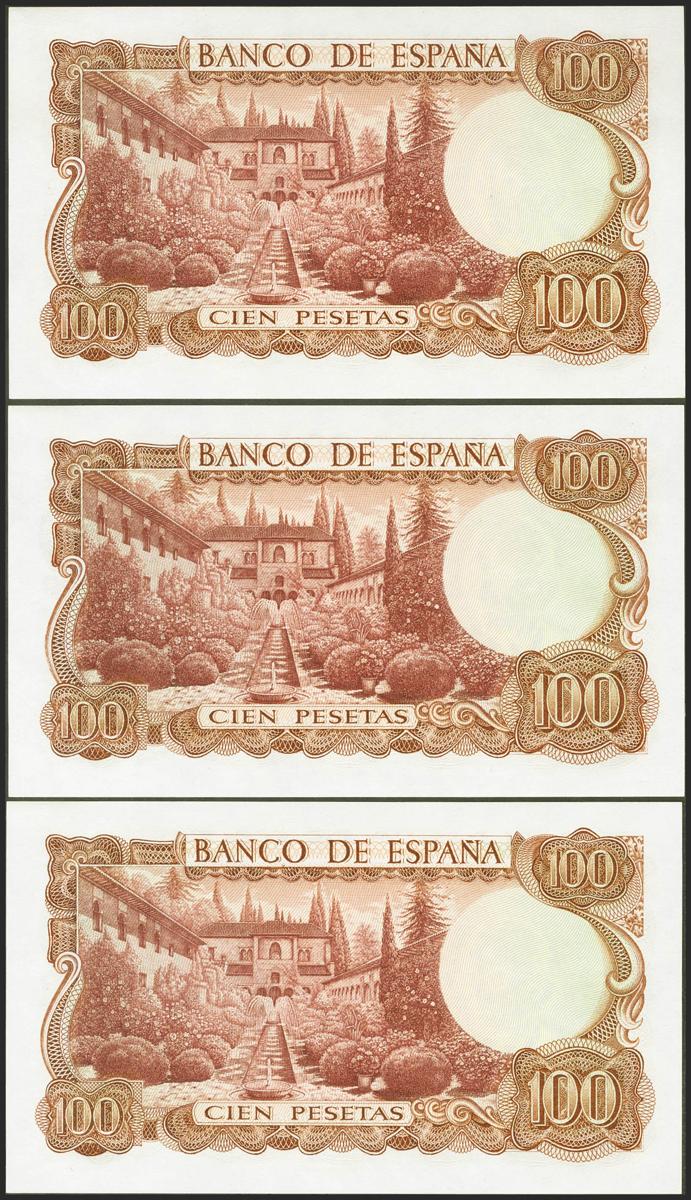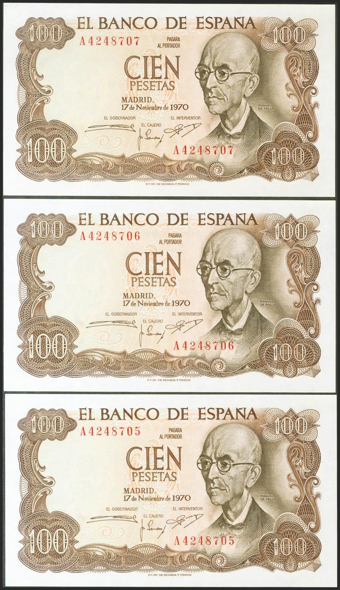 100 Pesetas. 17 de Noviembre de 1970. Trío correlativo. Serie A. (Edifil 2017: 472a). Apresto original. SC.