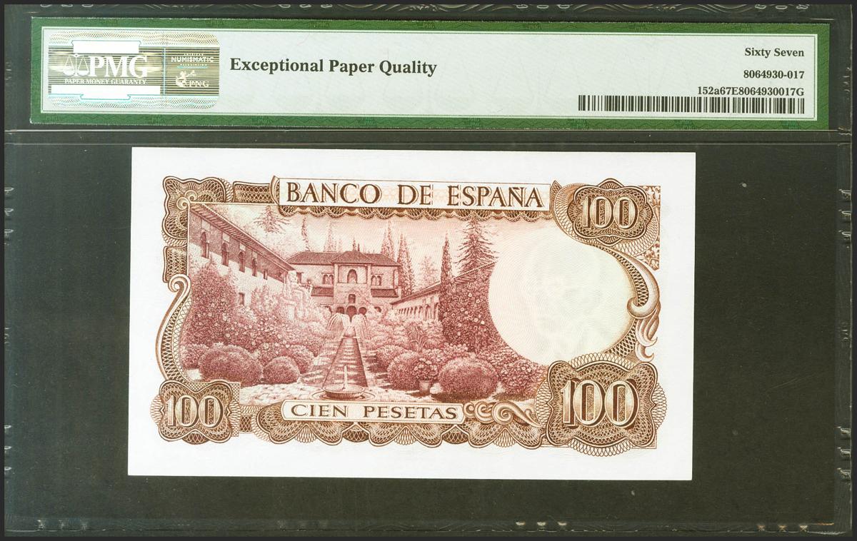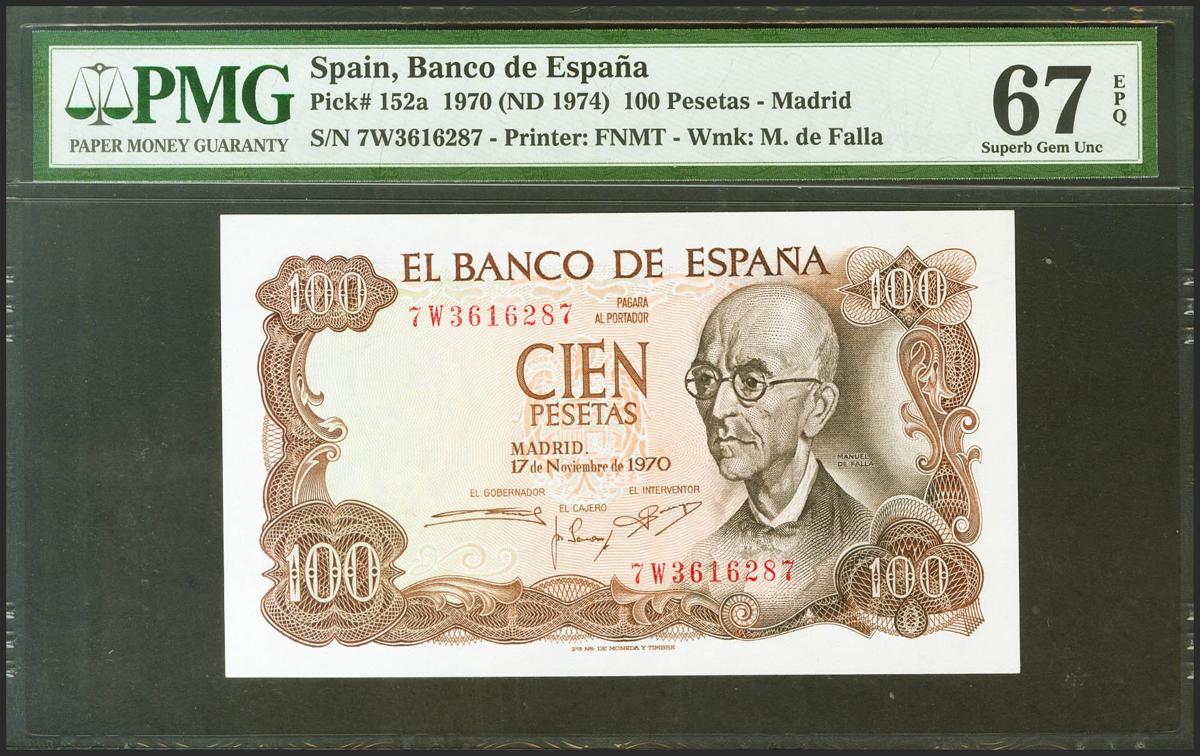 100 Pesetas. 17 de Noviembre de 1970. Serie 7W, última serie emitida. (Edifil 2021: 472c, Pick: 152a). Inusual en esta excepcional calidad, apresto original. SC. Encapsulado PMG67EPQ.