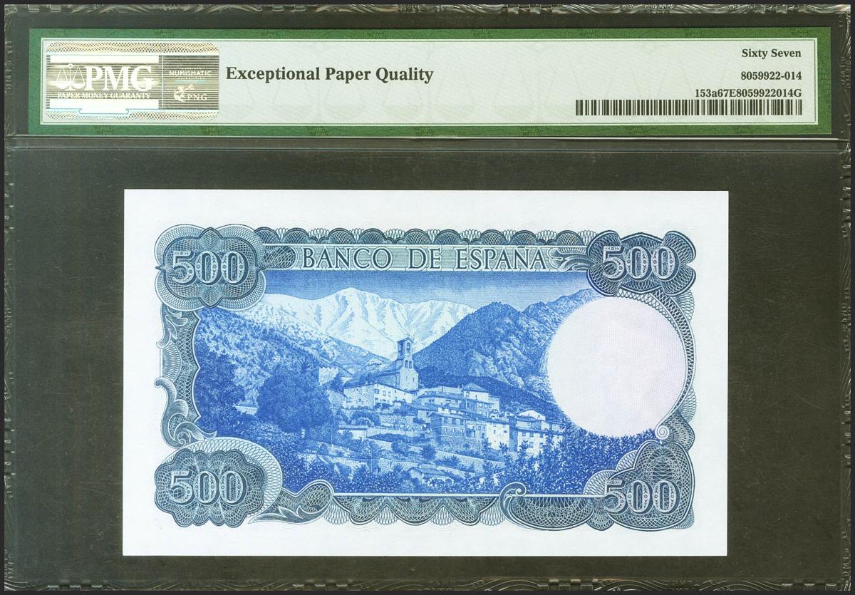 500 Pesetas. 23 de Julio de 1971. Sin serie. (Edifil 2021: 473, Pick: 153a). Raro en esta excepcional calidad, apresto original. SC. Encapsulado PMG67EPQ.
