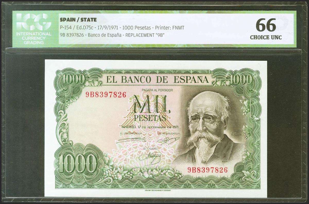 1000 Pesetas. 17 de Septiembre de 1971. Serie especial 9B. (Edifil 2021: 474d, Pick: 154). Inusual en esta excepcional calidad. SC. Encapsulado ICG66.