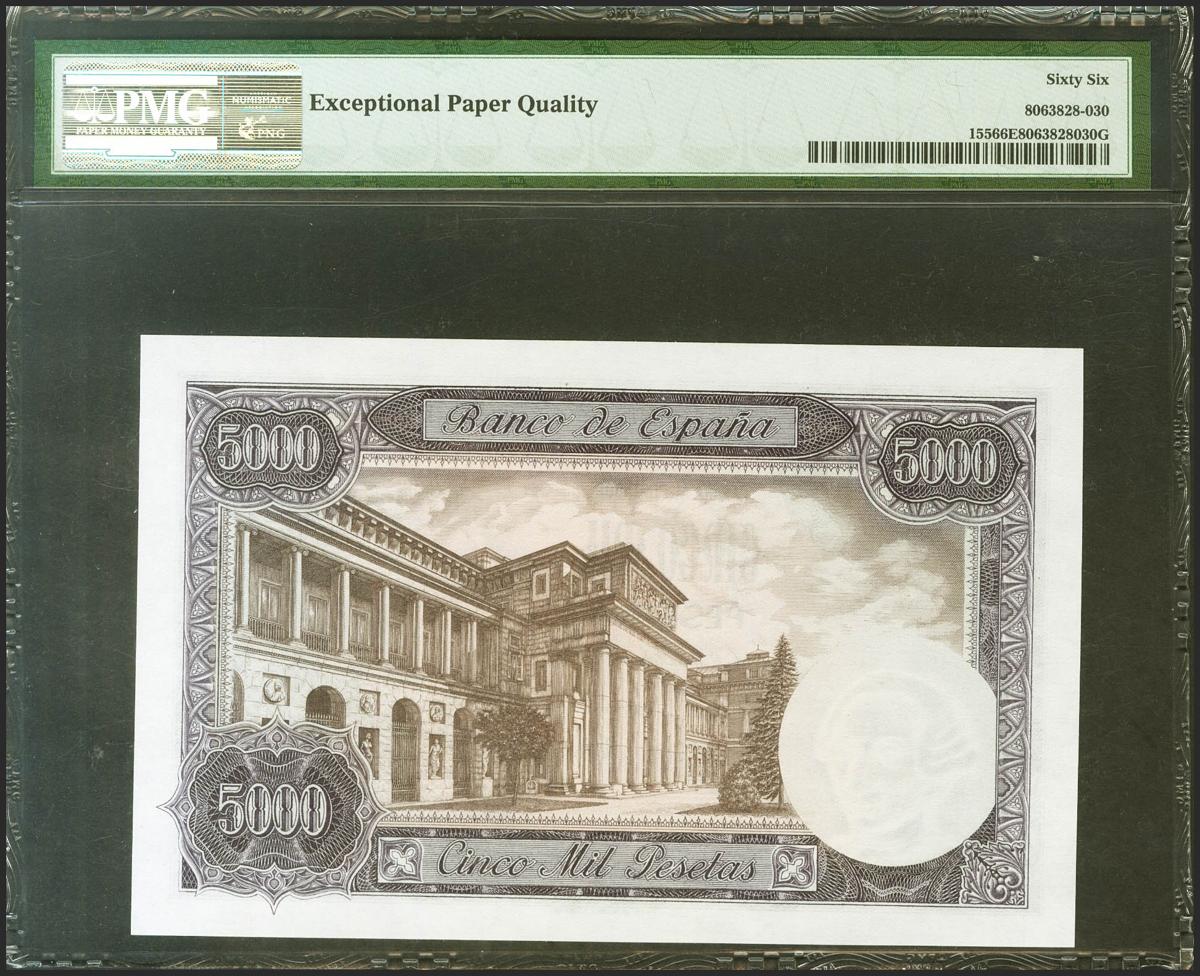 5000 Pesetas. 6 de Febrero de 1976. Sin serie. (Edifil 2021: 475, Pick: 155). Inusual en esta excepcional calidad, apresto original. SC. Encapsulado PMG66EPQ.