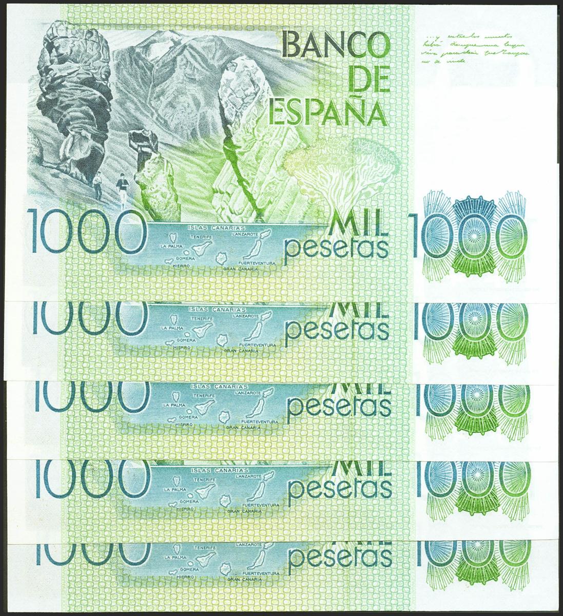 Conjunto de 5 billetes correlativos de 1000 Pesetas emitidos el 23 de Octubre de 1979, sin serie (Edifil 2021: 477). SC/SC-.