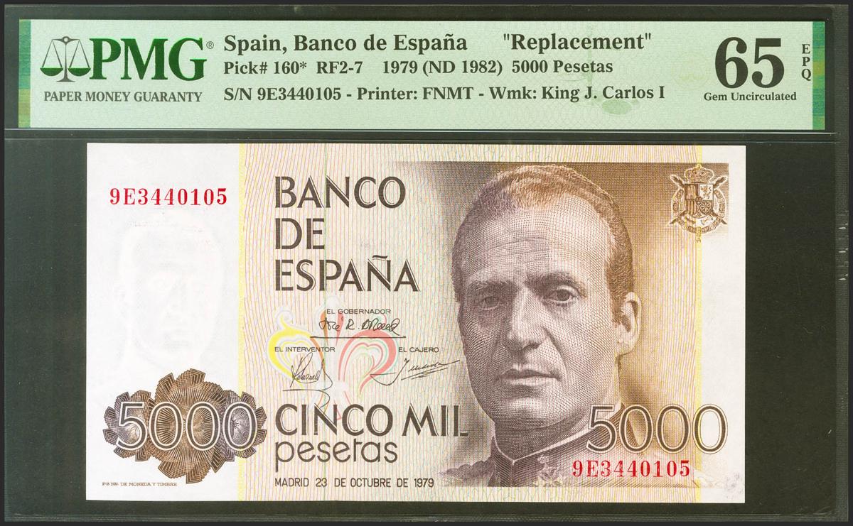 5000 Pesetas. 23 de Octubre de 1979. Serie especial 9E. (Edifil 2021: 478b, Pick: 160*). Raro en esta excepcional calidad, apresto original. SC. Encapsulado PMG65EPQ.