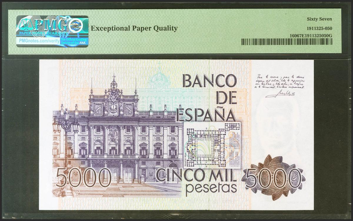 5000 Pesetas. 23 de Octubre de 1979. Sin serie y numeración bajísima. (Edifil 2021: 478, Pick: 160). Raro en esta excepcional calidad, apresto original. SC. Encapsulado PMG67EPQ.