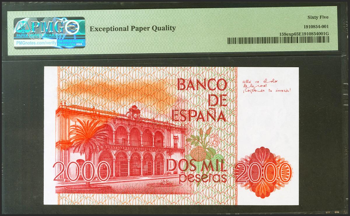 2000 Pesetas. 22 de Julio de 1980. Serie especial 8D. (Edifil 2021: 479c, Pick: 159exp). Extraordinariamente rara serie, para hacernos una idea de su rareza con la información estadística que disponemos nos atrevemos a afirmar que se trata, al menos, de una rareza tan importante como la serie 9B de Rosalía de Castro, apresto original. SC. Encapsulado PMG65EPQ.