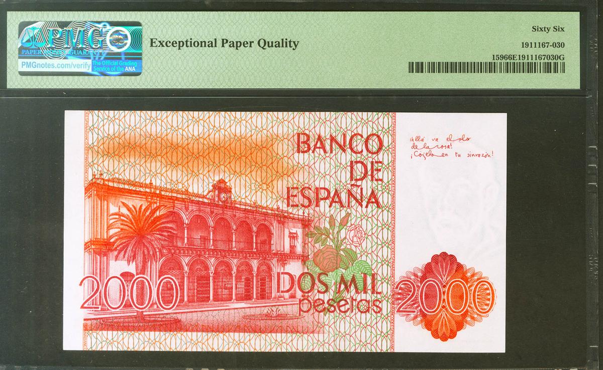 2000 Pesetas. 22 de Julio de 1980. Sin serie y numeración baja. (Edifil 2021: 479, Pick: 159). Inusual en esta excepcional calidad, apresto original. SC. Encapsulado PMG66EPQ.