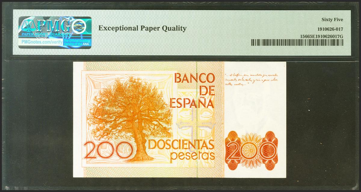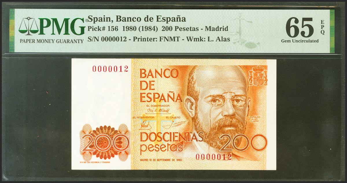 200 Pesetas. 16 de Septiembre de 1980. Sin serie y numeración bajísima. (Edifil 2021: 480, Pick: 156). Rarísimo, especialmente en esta excepcional calidad, apresto original. SC. Encapsulado PMG65EPQ.