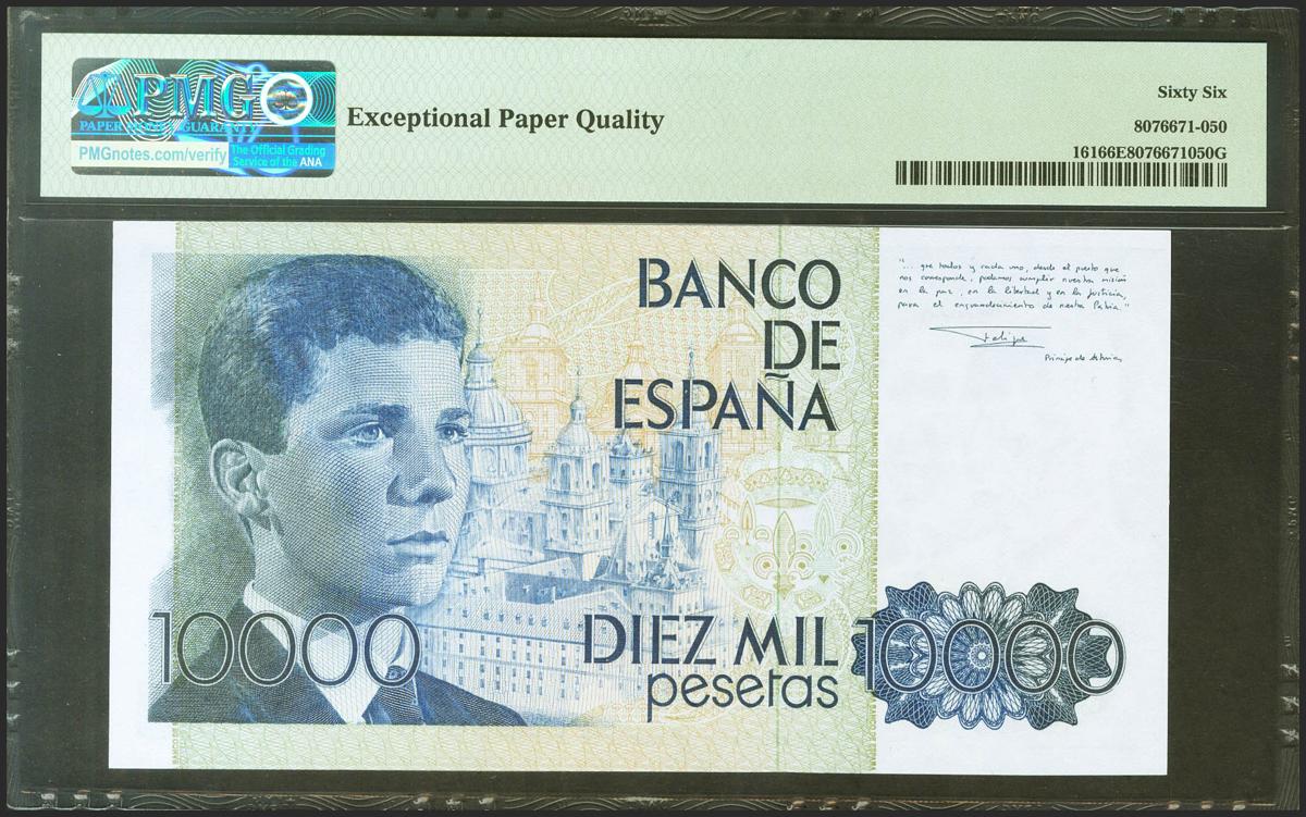 10000 Pesetas. 24 de Septiembre de 1985. Sin serie. (Edifil 2021: 481, Pick: 161). Inusual en esta excepcional calidad. SC. Encapsulado PMG66EPQ.