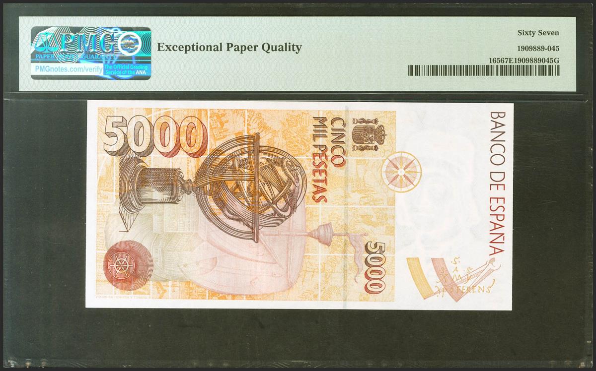 5000 Pesetas. 12 de Octubre de 1992. Sin serie. (Edifil 2021: 484, Pick: 165). Inusual en esta excepcional calidad, apresto original. SC. Encapsulado PMG67EPQ.