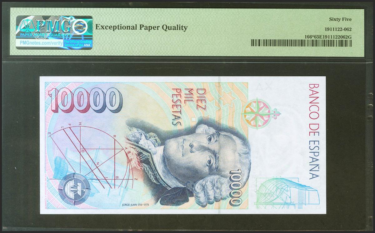 10000 Pesetas. 12 de Octubre de 1992. Serie especial 9A. (Edifil 2021: 485b, Pick: 166*). Raro en esta excepcional calidad, apresto original. SC. Encapsulado PMG65EPQ.