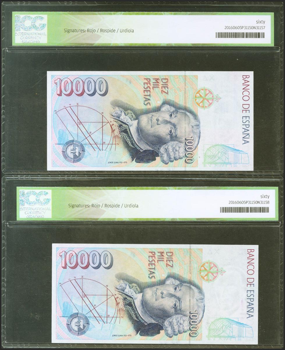 10000 Pesetas. 12 de Octubre de 1992. Pareja correlativa. Serie especial 9A. (Edifil 2017: 485b, Pick: 166). Encapsulados ICG60, ambos. SC.