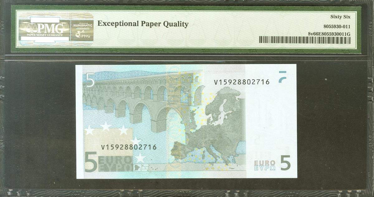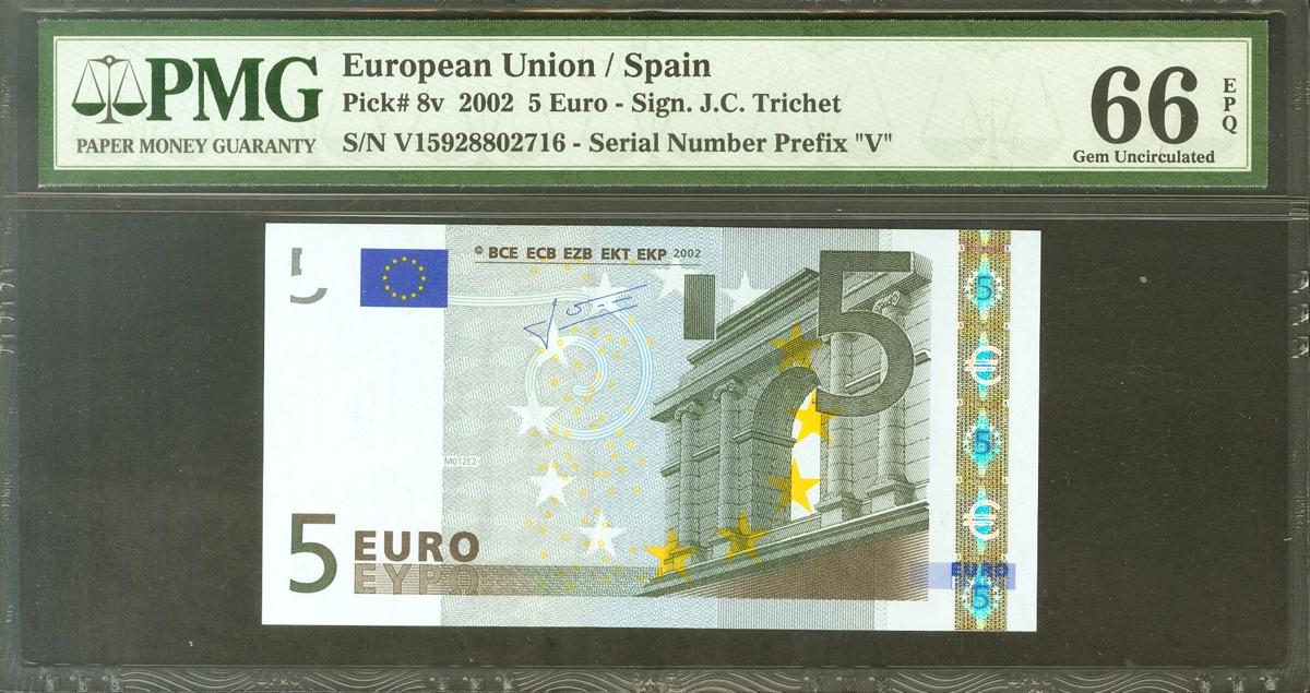5 Euros. 1 de Enero de 2002. Firma Trichet. Serie V (España). (Edifil 2021: 486, Pick: 8v). Apresto original. SC. Encapsulado PMG66EPQ.