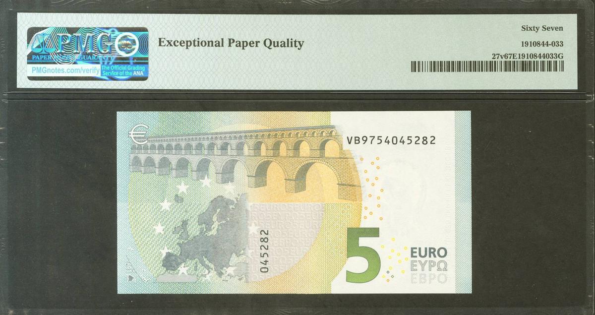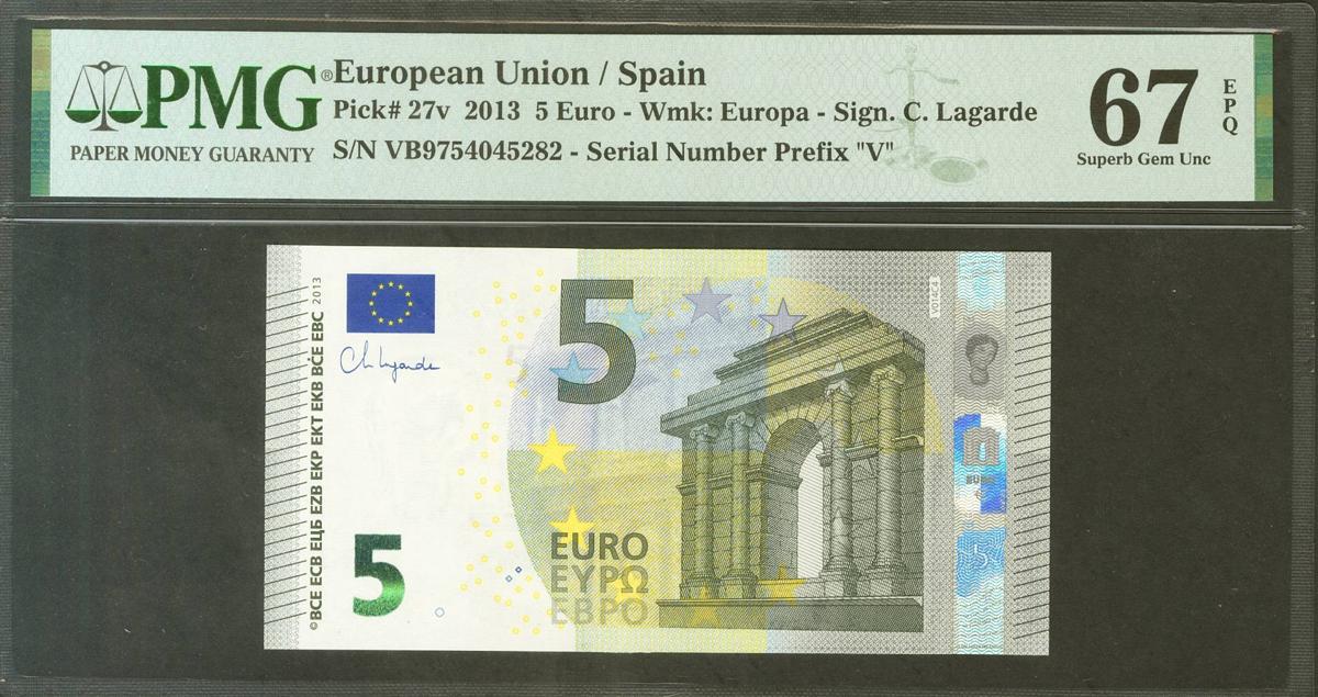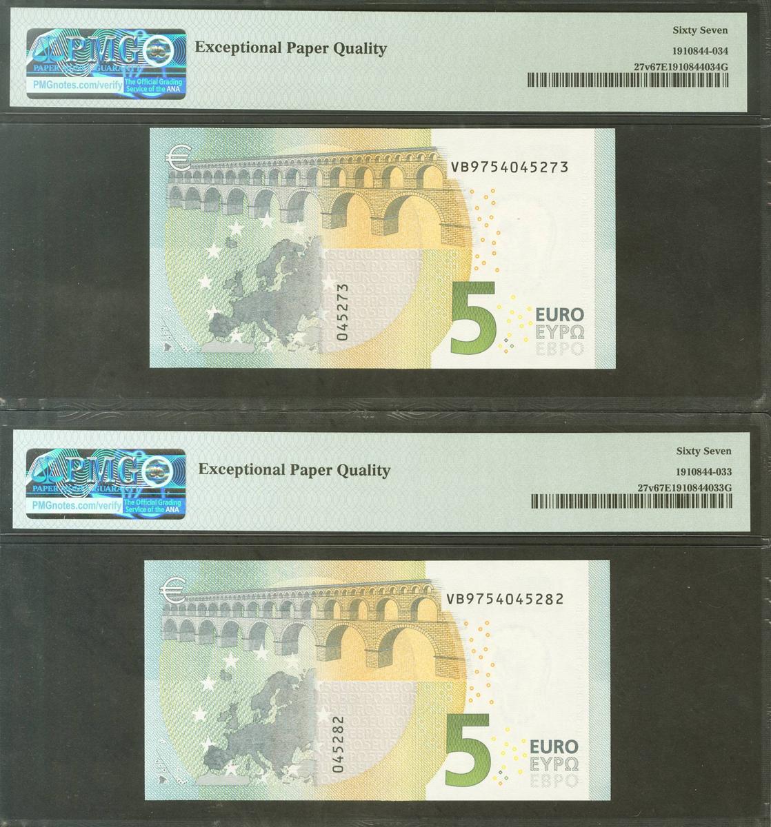 5 Euros. 2 de Mayo de 2013. Pareja correlativa (cabe recordar que el último dígito de la numeración de todos los billetes denominados en euro es para el control interno del Banco Central Europeo, el que marca la correlatividad de los billetes es el penúltimo dígito). Serie V (España). Firma Lagarde. (Edifil 2021: 493, Pick: 27v). SC. Encapsulado PMG67EPQ.