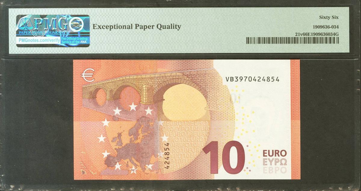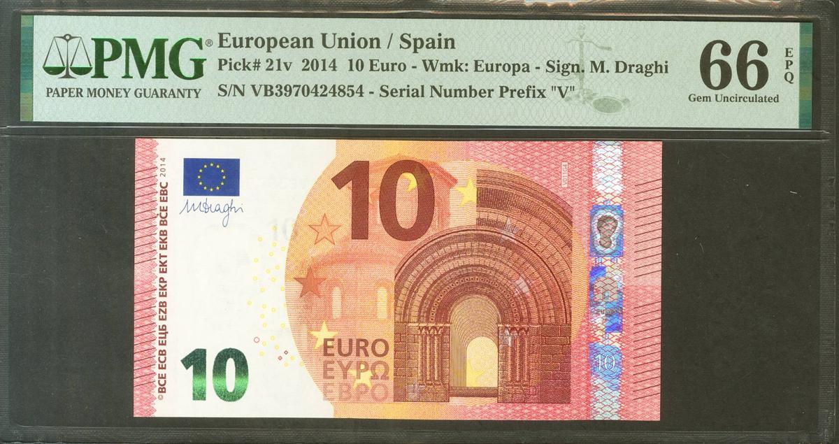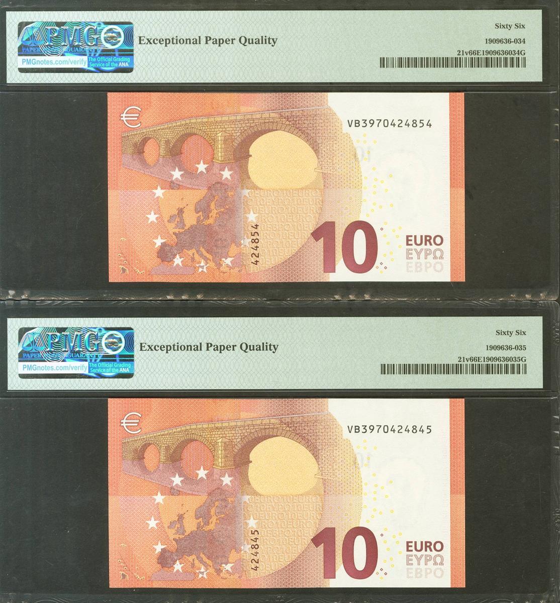 10 Euros. 23 de Septiembre de 2014. Pareja correlativa (cabe recordar que el último dígito de la numeración de todos los billetes denominados en euros es para control interno del Banco Central Europeo, el que marca la correlatividad de los billetes es el penúltimo dígito). Firma Draghi. Serie V (España). (Edifil 2021: 494, Pick: 21v). SC. Encapsulado PMG66EPQ.