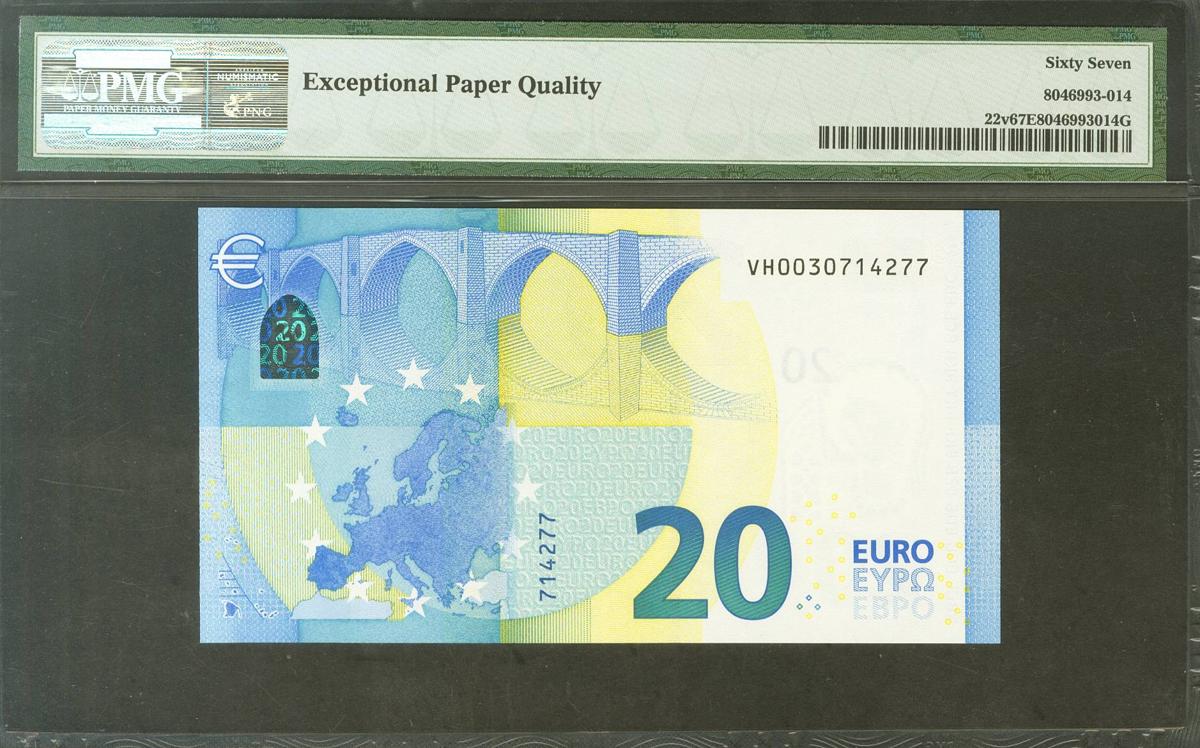 20 Euros. 25 de Noviembre de 2015. Firma Draghi. Serie especial VH (España). (Edifil 2021: 495, Pick: 22v). SC. Encapsulado PMG67EPQ