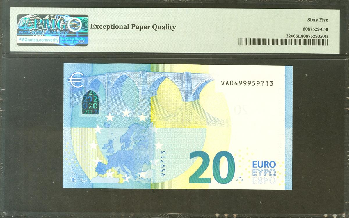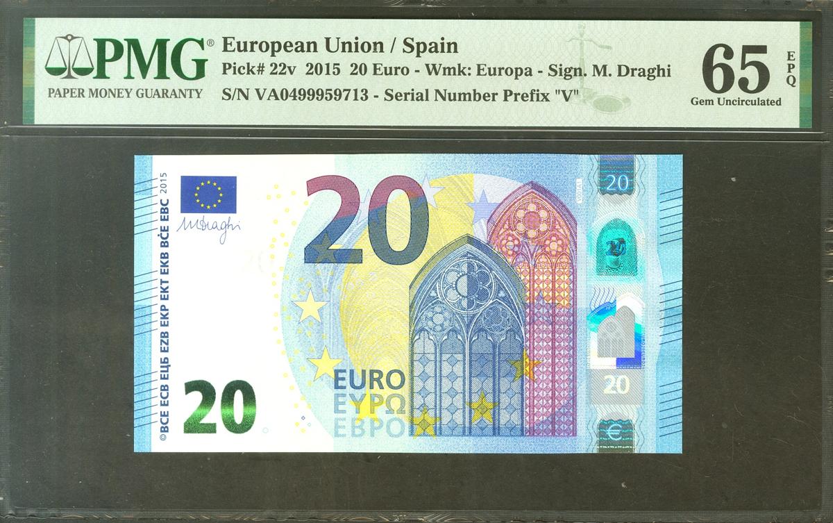 20 Euros. 25 de Noviembre de 2015. Firma Draghi. Serie V (España). (Edifil 2021: 495). Apresto original. SC. Encapsulado PMG65EPQ.
