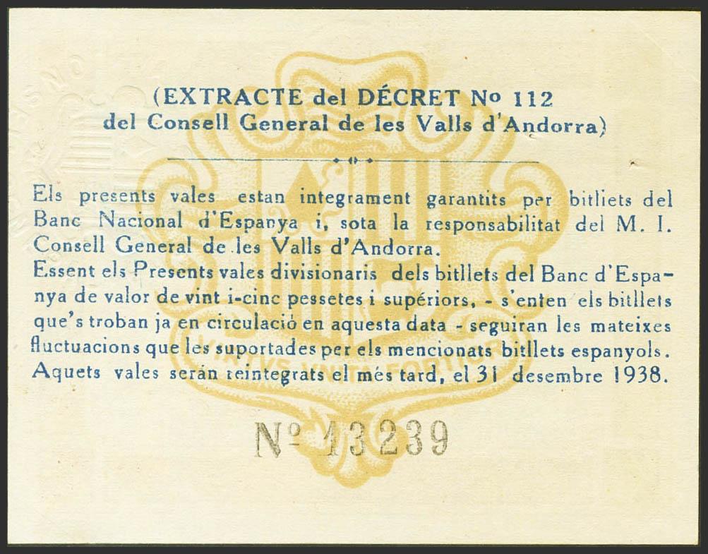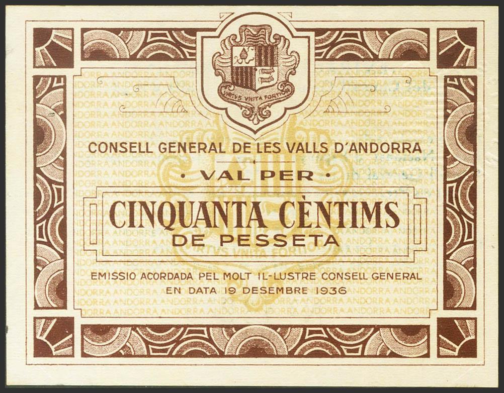 ANDORRA. 50 Centims. 19 de Diciembre de 1936. Sin serie. (Edifil 2021: 1, Pick: 5). Apresto original, puntitos de grapa, sin doblez alguno. EBC+.