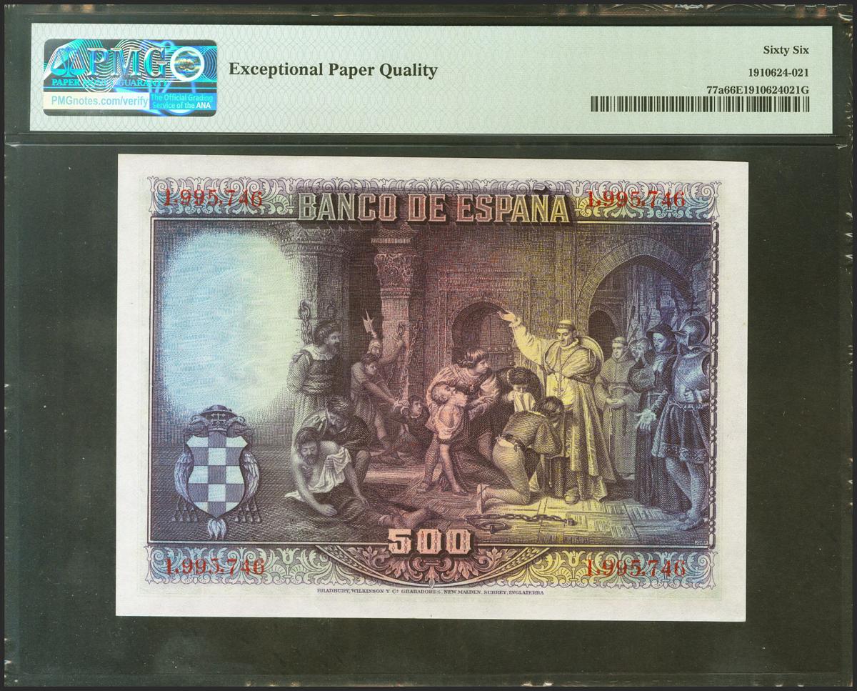 500 Pesetas. 15 de Agosto de 1928. Sin serie. (Edifil 2021: 356, Pick: 77a). Raro en esta excepcional calidad, apresto original. SC. Encapsulado PMG66EPQ.