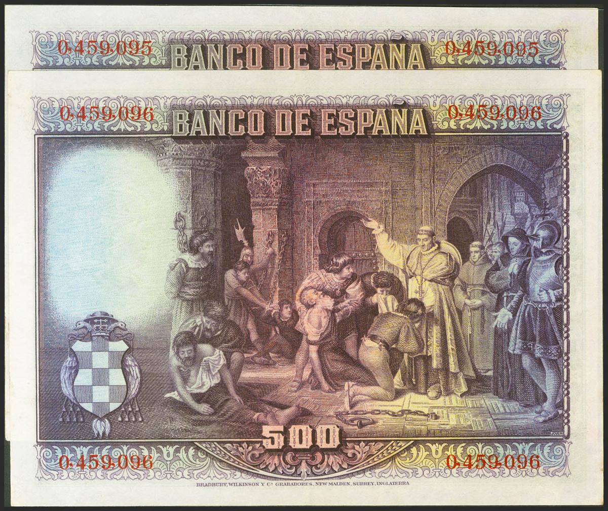 500 Pesetas. 15 de Agosto de 1928. Pareja correlativa. Sin serie. (Edifil 2021: 356). Conserva parte de su apresto original. EBC+.